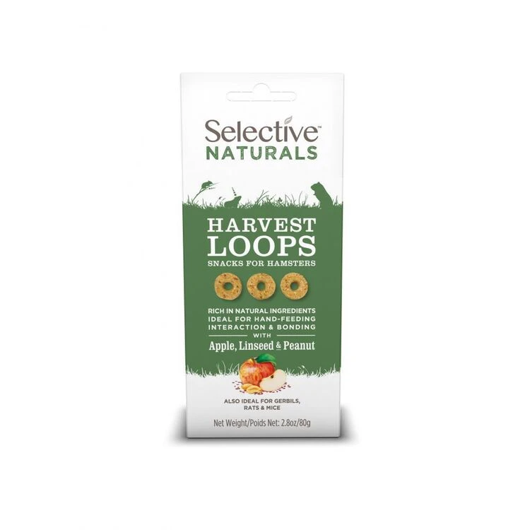 Selective Naturals Harvest Loops for hamsters, gerbils, rats & mice, with Apple, Linseed & Peanut. Healthy indulgent treats, high in fibre with no added sugar.