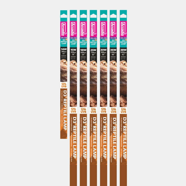 Arcadia D3+ Reptile Lamp, 12% UVB is for desert reptile species which in particular are naturally exposed to strong sunlight and require relatively high concentrations of UV-B light and so should be kept under a 12% UV-B D3+ Reptile Lamp.