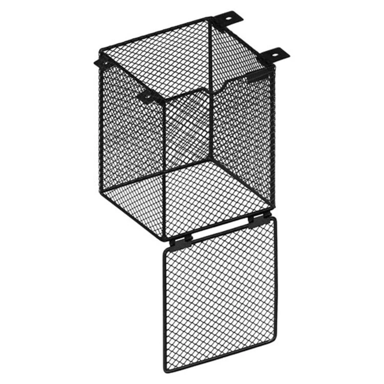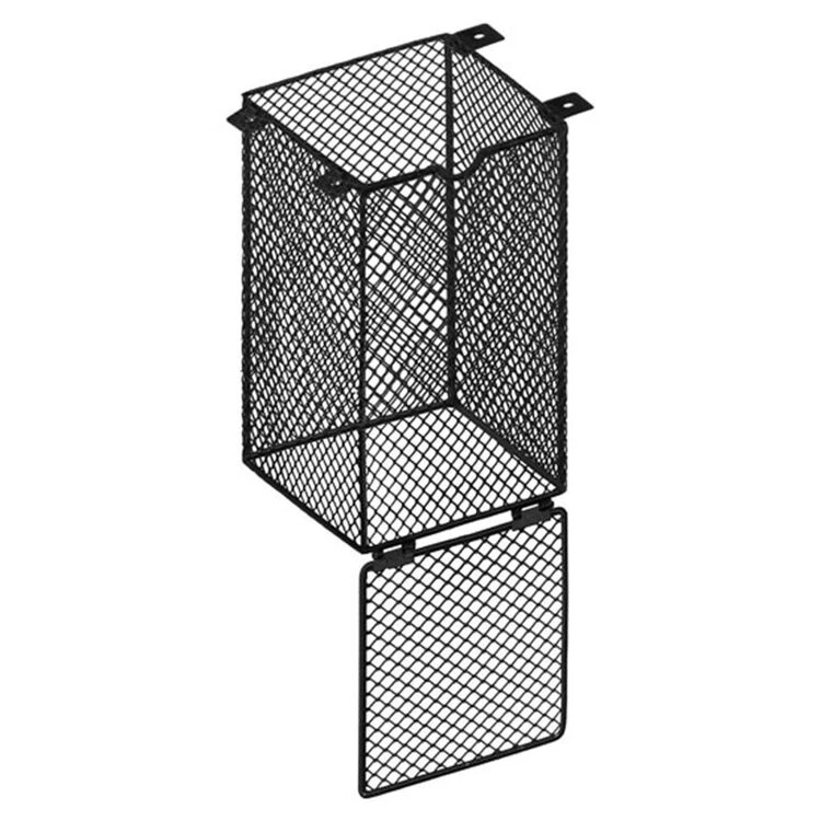 The HabiStat Heater Guard, Rectangular is a black, rectangular, powder coated wire mesh guard for use with spot lamps and smaller ceramic heaters. Easy access via hinged bottom to replace bulbs. Simply screw to vivarium top. Has recess to allow wire from heater to be accomodated.