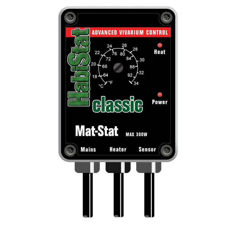 The HabiStat Mat Stat is an on/off thermostat that is ideal for controlling the temperature of heat mats and other low powered heaters up to a maximum load of 300 watts.