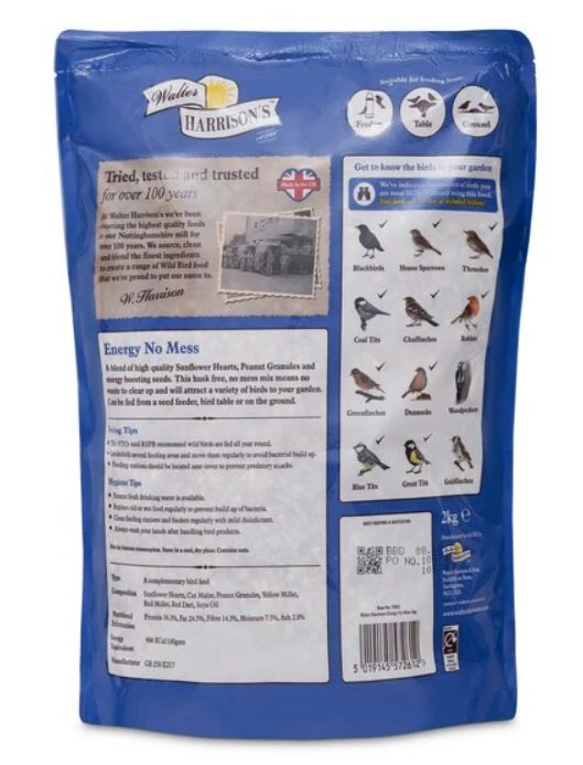 Walter Harrisons no mess is a blend of high quality, energy boosting seeds. This husk free, no mess mix means no waste. Attracts a variety of garden birds. Can be fed from a seed feeder, bird table or on the ground.