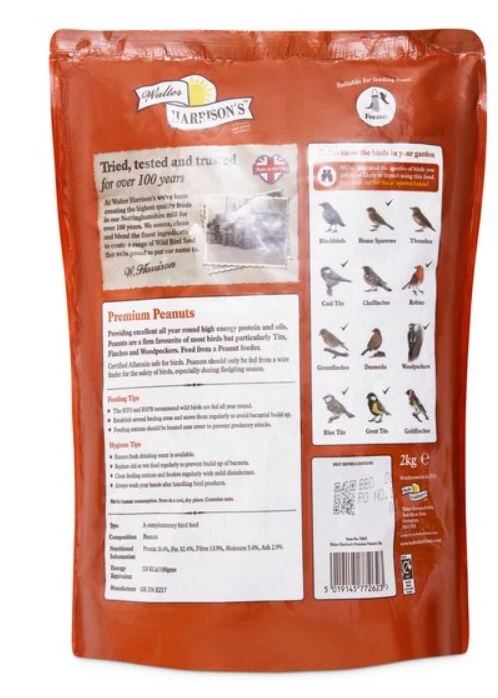 Walter Harrisons premium peanuts. High in energy, protein and oils. Attracts a variety of garden birds. Certified Aflatoxin safe. Peanuts should only be fed from a wire Peanut feeder for the safety of birds.