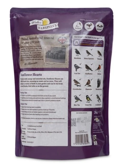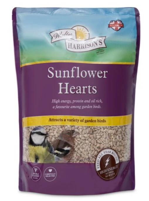 Walter Harrisons sunflower hearts. Packed with energy and essential oils. 100% husk free, meaning no waste and no mess. Attracts a variety of garden birds. Can be fed from a seed feeder, bird table or on the ground.