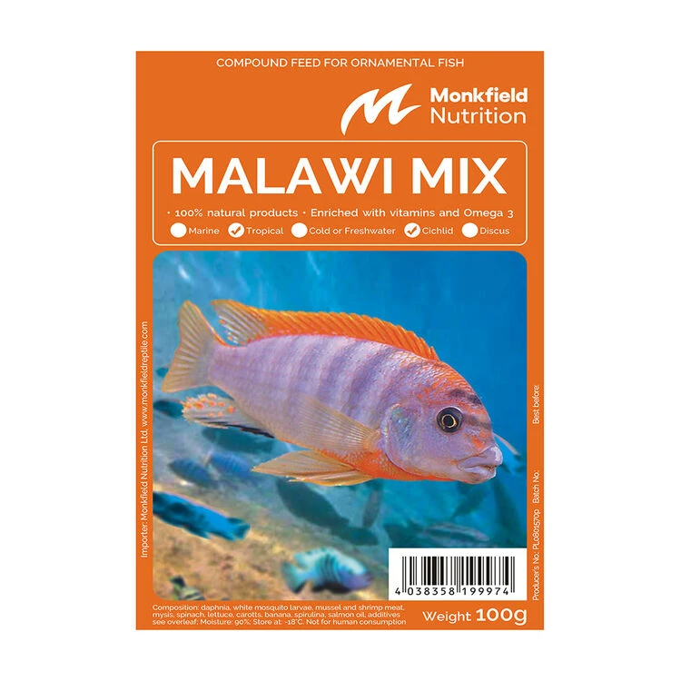 10 blister packs containing 30 individual portions of Cichlid Mix per pack. Cichlid Mix frozen fish food is made from 100% natural products and enriched with vitamins and Omega 3.Suitable for Tropical and Cichlid varieties of fish.NOT FOR HUMAN CONSUMPTION.