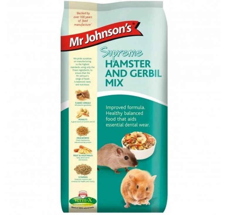Mr Johnson’s Supreme Hamster & Gerbil Mix is a complementary feed that is highly nutritious. It has been made with a delicious blend of fruits, cereals, vegetables and seeds, as well as nuts and tasty mealworms.