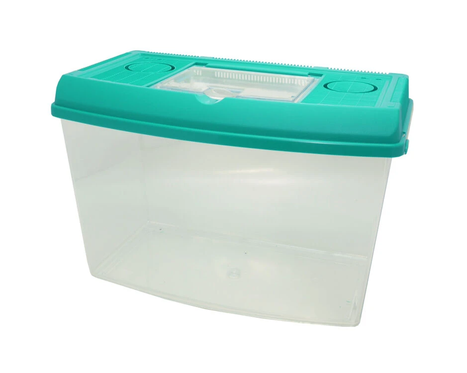 Ideal home for small critters. Ideal for safe & secure transportation of small pets. Suitable for temporary housing whilst cages and tanks are being cleaned. Secure nursery tank for small rodents. Secure hinged lid and access door. Easy to clean. Approx external dimensions L 37cm W 23cm H 25cm