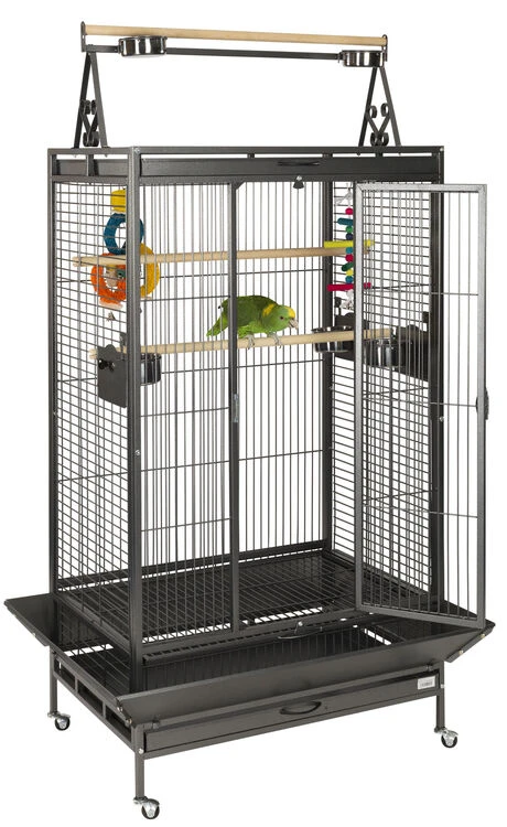 With 5 stainless steel feeding bowls and 3 perches for your bird to sit on, this cage is very spacious. There is a slide-out tray which makes for easier cleaning and the cage is finished with oven baked powder that has been coated in non-toxic paint.