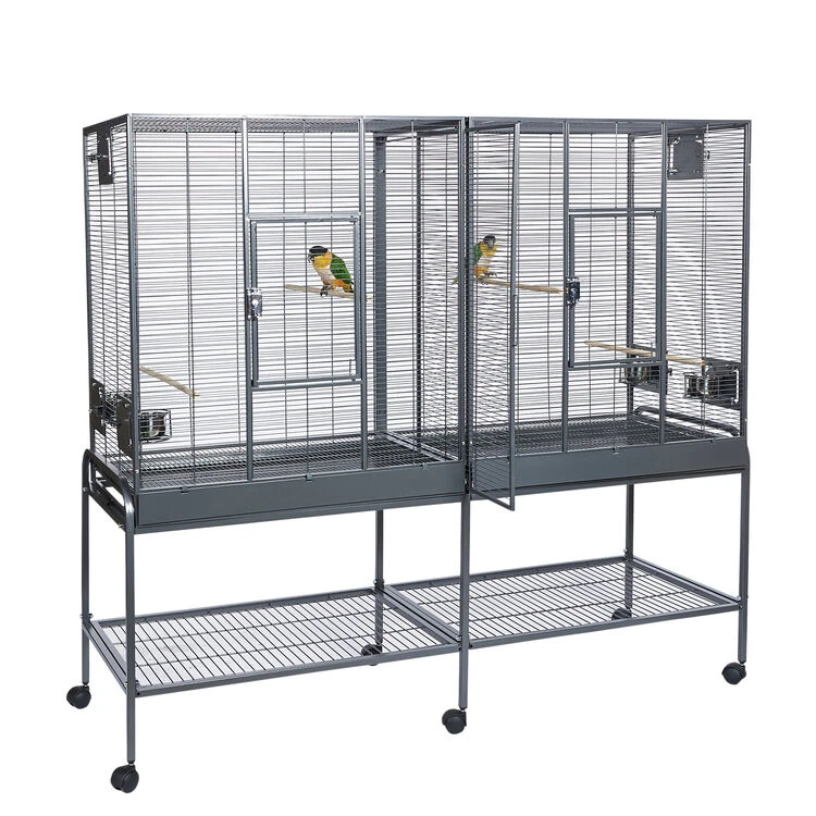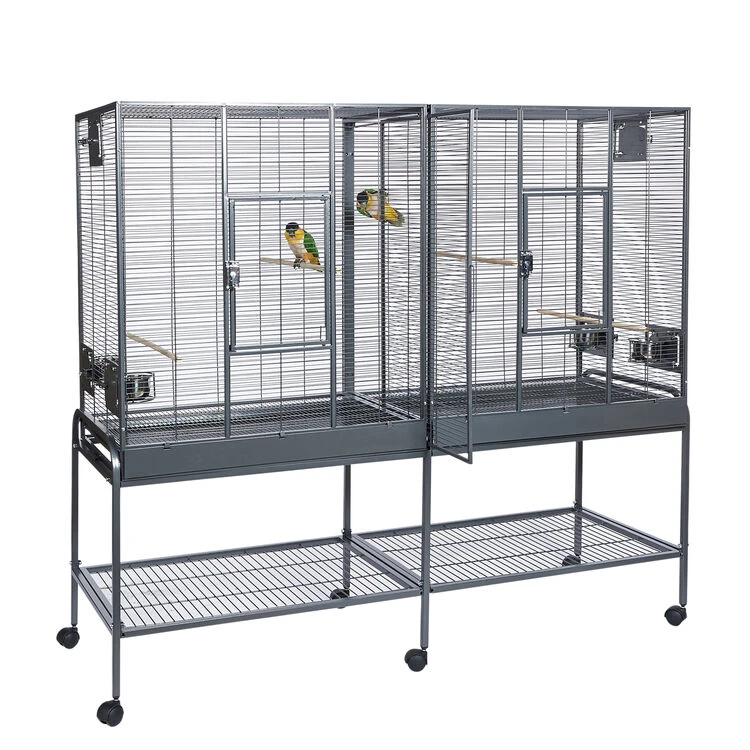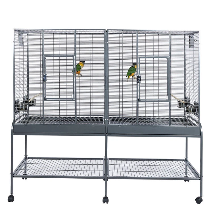 The Double Flight Cage features a pull out cleaning tray, pull out divider safety grill, castors and two large wing opening front doors. The Double Flight Cage includes four wooden perches and four feeding bowls. The Double Flight Cage can be used without the stand.