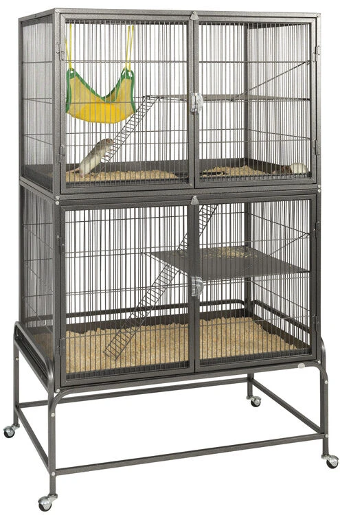 With two levels that have been made from coated metal and four large swing open doors for easy access, this cage will be safe and secure. There are three ladders and two hammocks to entertain your pet, which is set upon wheels to make it easy to move around.