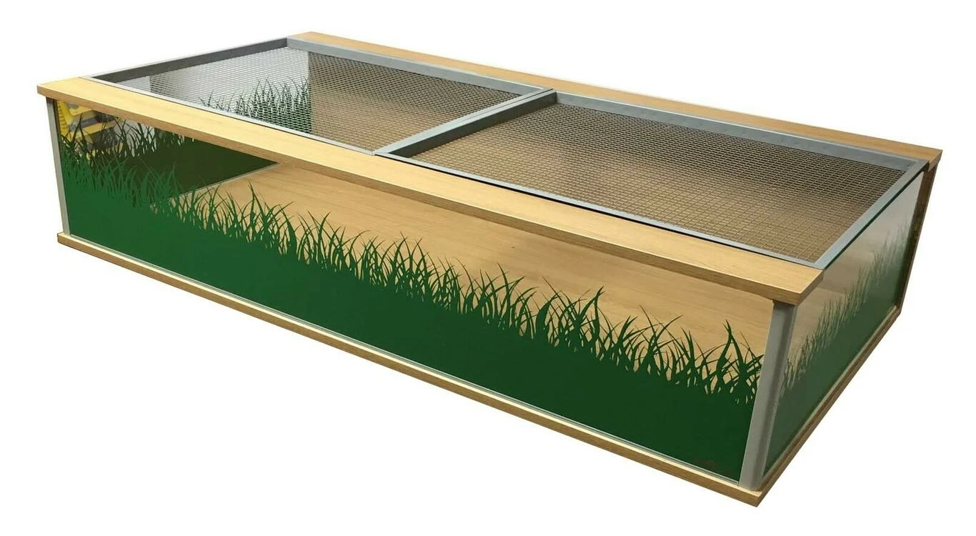 The Vivexotic Deluxe Tortoise Table makes an ideal home for Mediterranean Spur Thighed, Horsfield, Hermann’s and Marginated tortoise species. Glass panels to the front and sides provides a superb all round view of your tortoise whilst the printed grass pattern prevents your tortoise ‘banging’ against the glass – a common problem with glass enclosures. The full length removable mesh lid allows full ventilation, whilst preventing other pets jumping into the table and the included easy to fit Exo Terra light bracket makes adding an essential and adjustable overhead heat source simple.